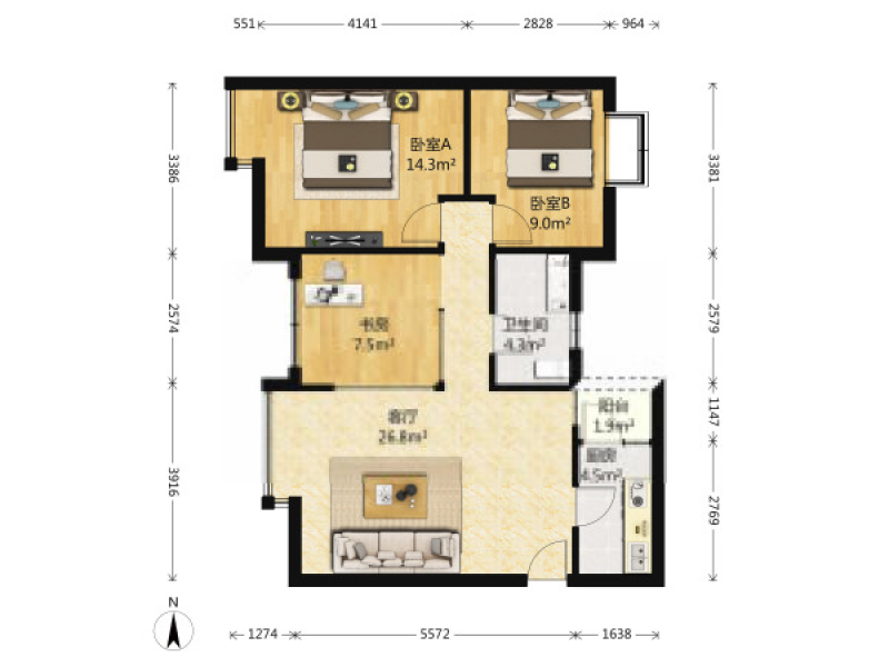 3室2厅1卫90平米